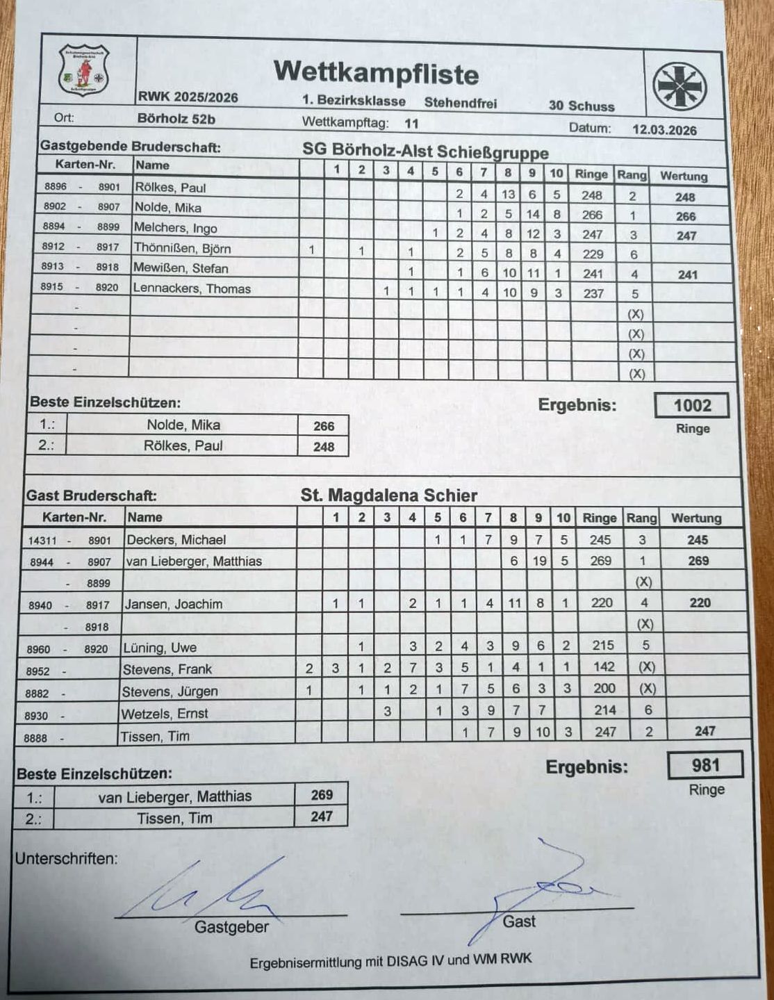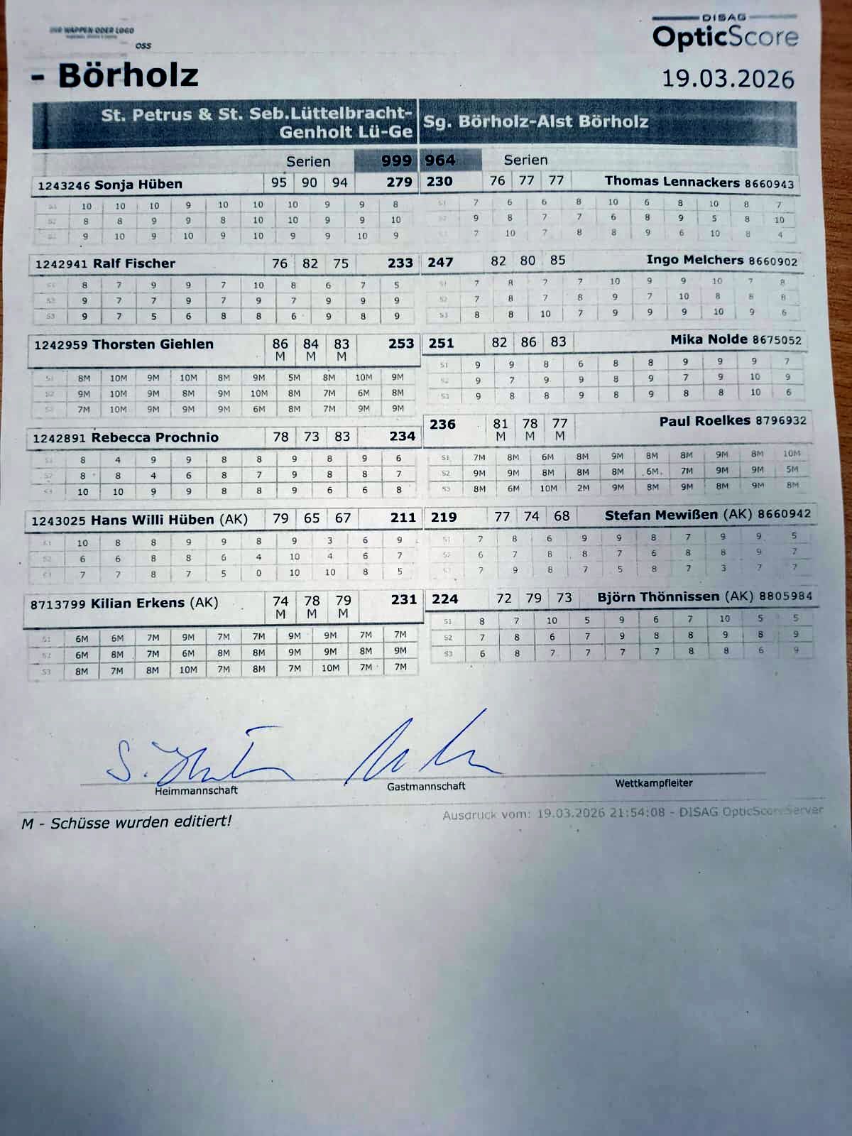 Mit einer sehr starken Leistung gegen St. Sebastianus Amern II die Tabellenspitze verteidigt. Börholz-Alst siegte mit 990:979. Bester Schütze des Wettkampfes Ralf Schankweiler mit 249 Ringen