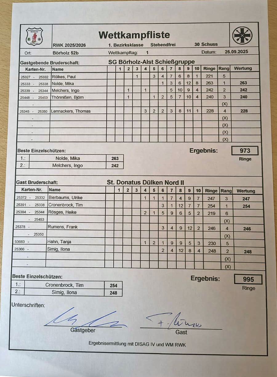 Die Freistehend Mannschaft startete ebenfalls mit einer Niederlage in die neue Saison. Der Abgang von Lena Rosowski macht sich wohl bewerkbar. Börholz-Alst verlor den Heimkampf gegen St. Donatus Dülken Nord II mit 973:995. Bester Börholz-Alster Schütze war Mika Nolde mit 263 Ringen.