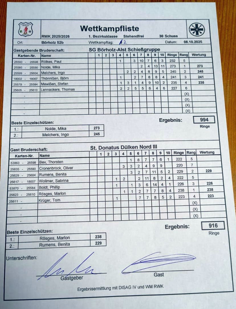 Am 2. Wettkampftag dann der erste Sieg für die Stehendfrei Schützen. Börholz-Alst gewann gegen St. Donatus Dülken Nord III mit 994:916.